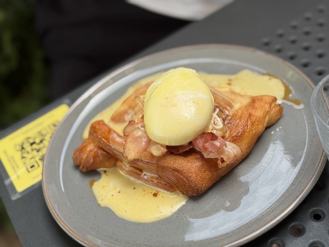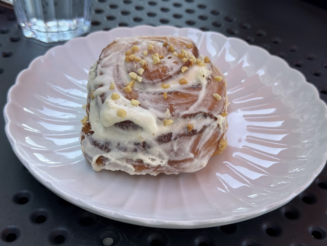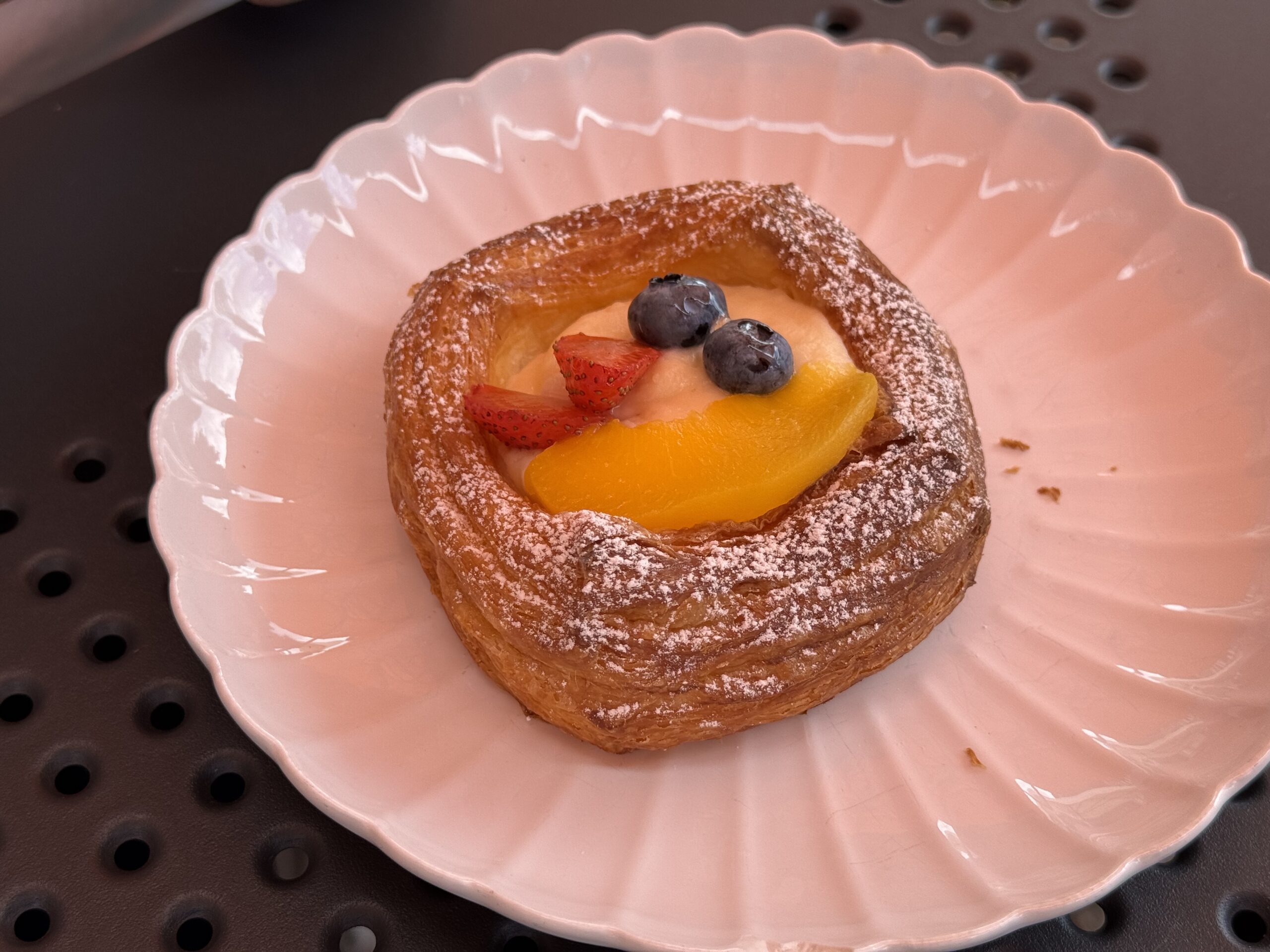 Za pultem tentokrát nebyl sympatický mladý muž, který si s námi včera příjemně povídal (a který si u mě hned získal přezdívku „můj kámoš z Litvy“), ale jeho italská přítelkyně. Byla neméně ochotná a kafe uměla udělat stejně dobré. Ač bylo krátce po poledni, dal jsem si croissant sypaný mandlemi a focacciu. Obojí bylo opět naprosto vynikající: croissant krásně jemný s výraznou máslovou chutí, focaccia vláčná, výborně ochucená a očividně čerstvá. Manželka si dala taktéž focacciu, byť jinak obloženou, a zákusek, který umělá inteligence označuje jako dánský koláček.