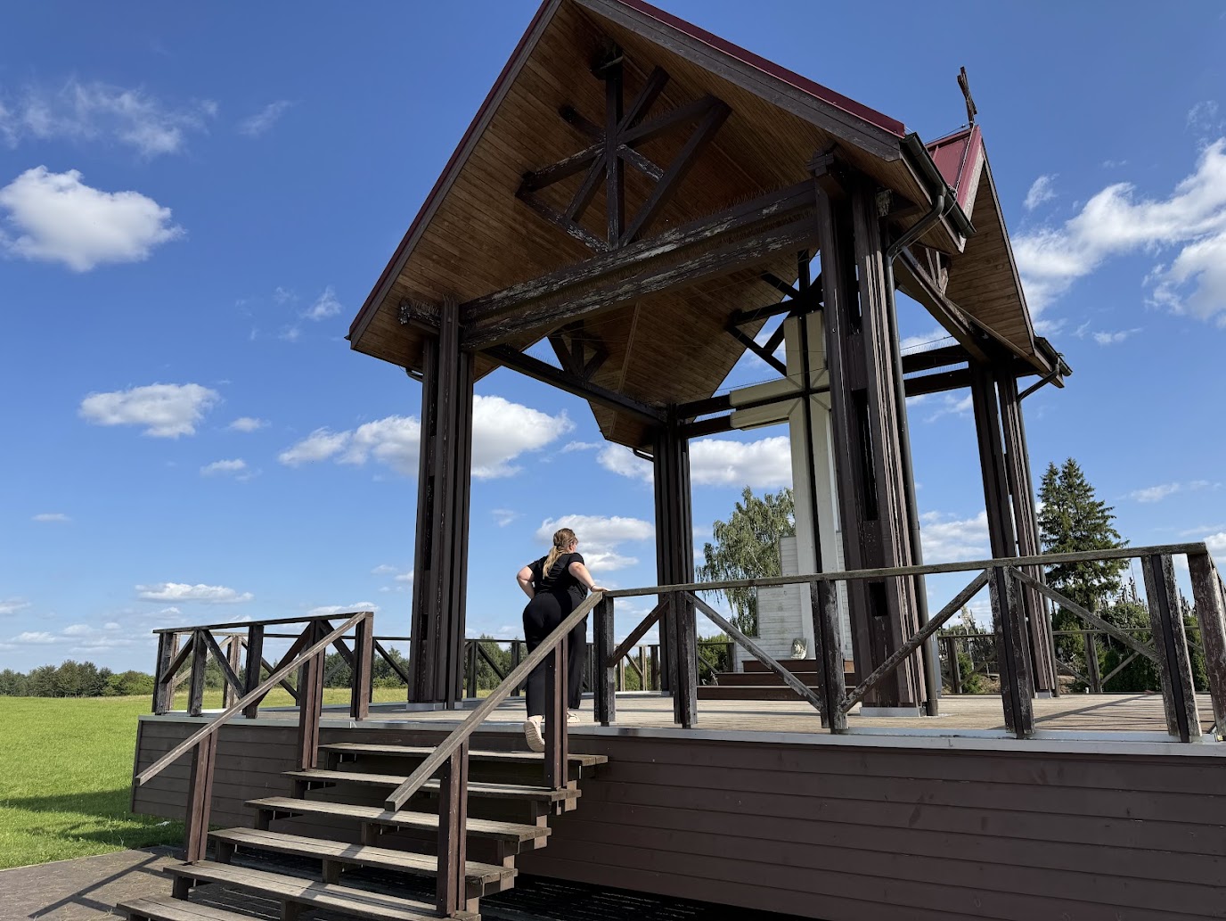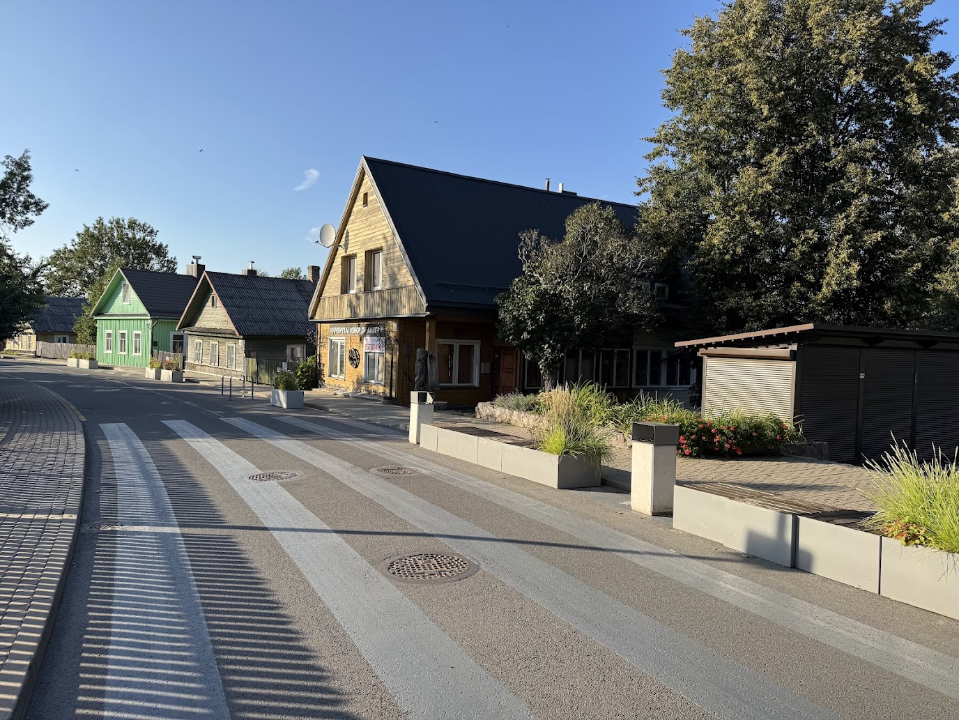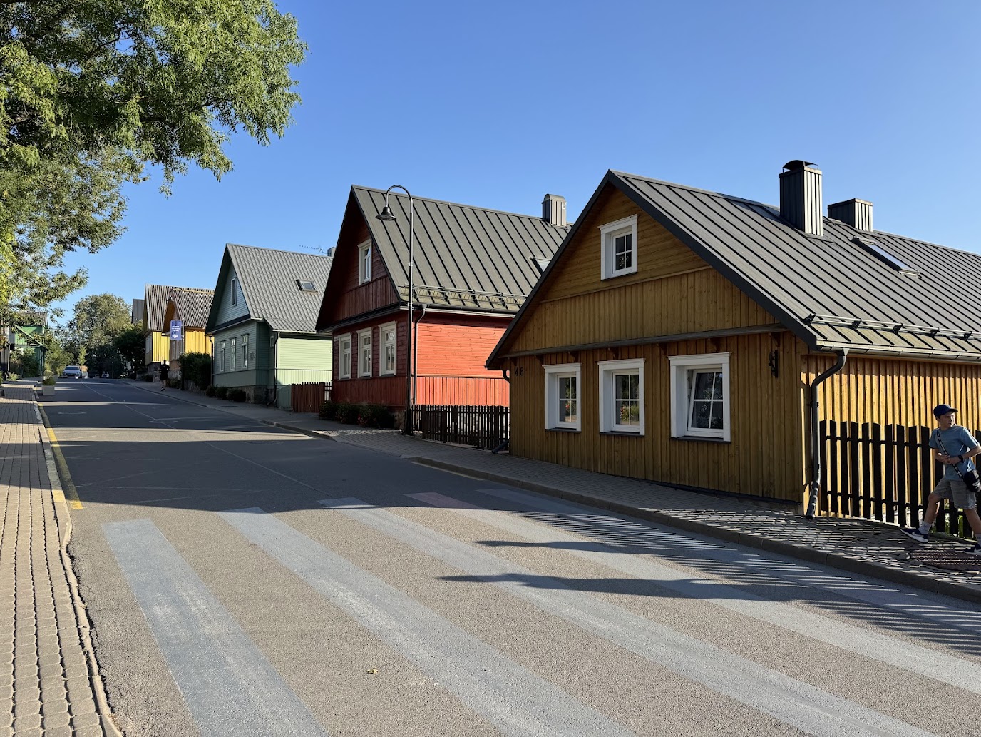 Cesta nás vedla po hlavní ulici v Trakai, která nese jméno Karaimų gatvė. Zde nelze přehlédnout malebné dřevěné domky, které lemují cestu vedoucí k hradu. Nejde o běžnou lidovou architekturu, ale o dědictví Karaimů, malého turkického etnika vyznávajícího specifickou formu judaismu. Tyto domy, často natřené výraznými barvami, stojí štítovou stranou do ulice a mají jednu architektonickou zvláštnost, která ihned upoutá pozornost.