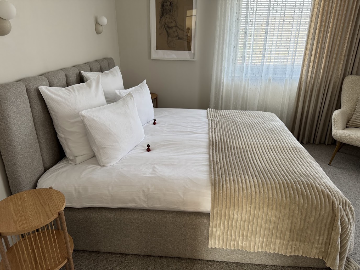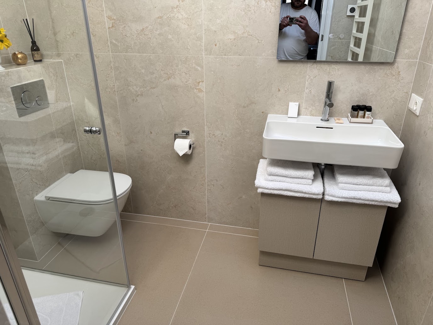 V obýváku byly dvě sedačky, televize a hlavně klimatizace, která byla po našem příjezdu zapnutá, takže i když se byt nacházel v podkroví, bylo zde velmi příjemně. V kuchyni bylo vše, co jsme potřebovali, včetně ledničky, myčky nádobí a posezení pro čtyři lidi. Koupelna se záchodem byla moderně vybavená a v ložnici na nás čekala velká a nesmírně pohodlná postel. Veškeré vybavení bylo vkusné a bylo na něm vidět, že hostitel nešetřil. Tohle bylo opravdu špičkové bydlení!