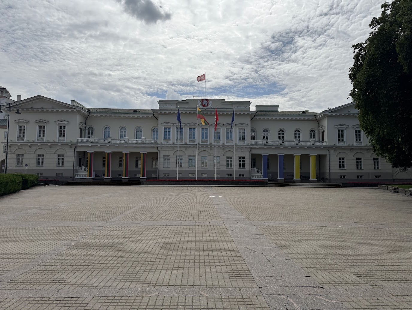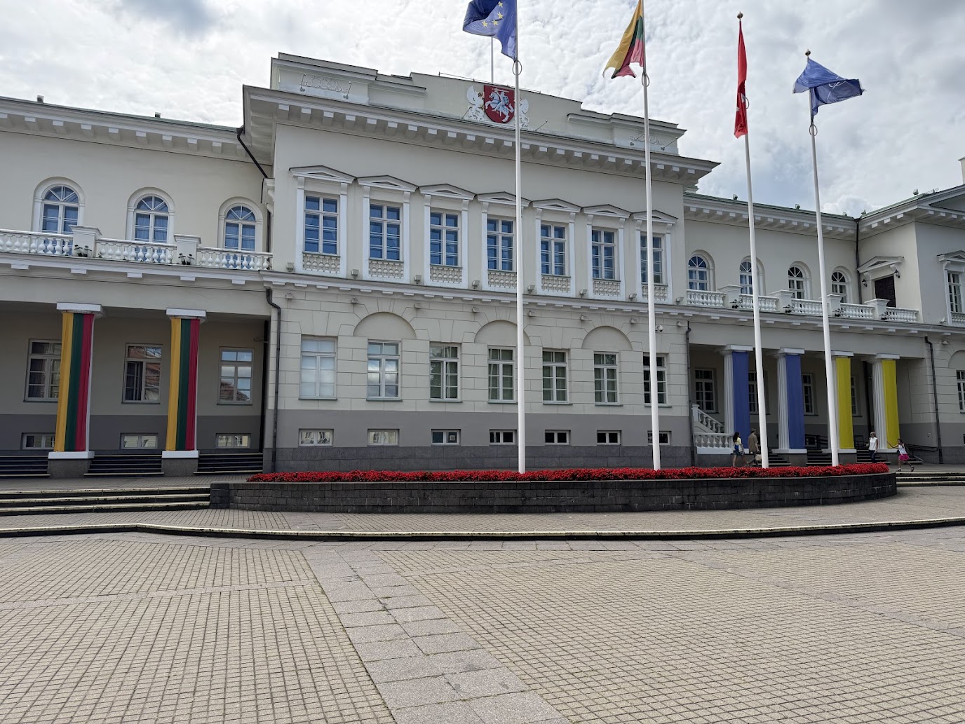 Díky keškám jsme se následně přesunuli k budově, kde dnes sídlí Kancelář prezidenta Litevské republiky. Ta je jedním z nejvýznamnějších symbolů litevské státnosti. Původně se jednalo o palác vilniuských biskupů, jehož historie sahá až do 14. století. Svou dnešní, přísně klasicistní podobu, získal až na přelomu 18. a 19. století, kdy sloužil jako rezidence carských generálních gubernátorů. Jeho autorem je prominentní ruský architekt Vasilij Stasov.