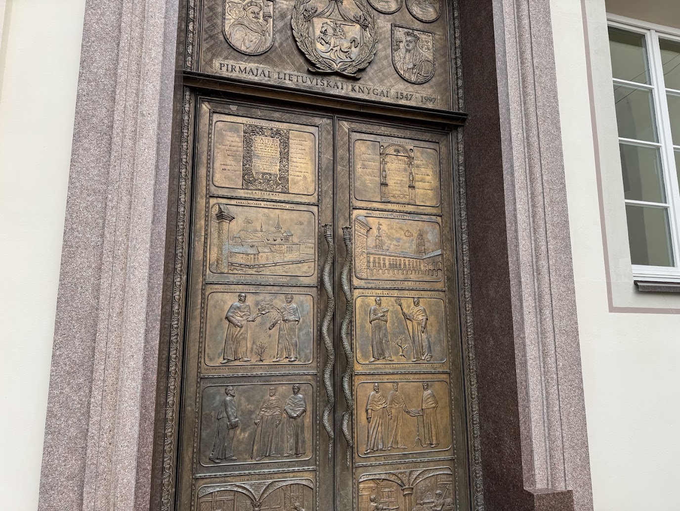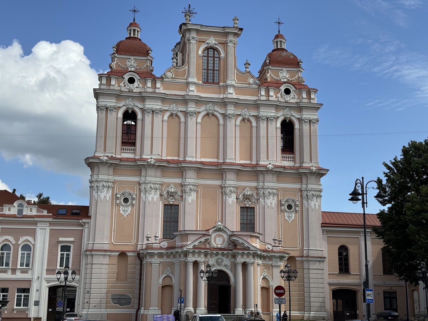 Na opačné straně nás pak zaujala další budova Vilniuské univerzity. Při pohledu na hlavní průčelí Vilniuské univerzity by se mohlo zdát, že jde o ryze klasicistní stavbu. Elegantní portikus se šesti dórskými sloupy a trojúhelníkovým štítem skutečně působí jako z antického Řecka. Tento vzhled je však výsledkem až přestavby z 19. století, která měla za cíl sjednotit roztříštěnou fasádu starších budov a dát univerzitě moderní, reprezentativní tvář.