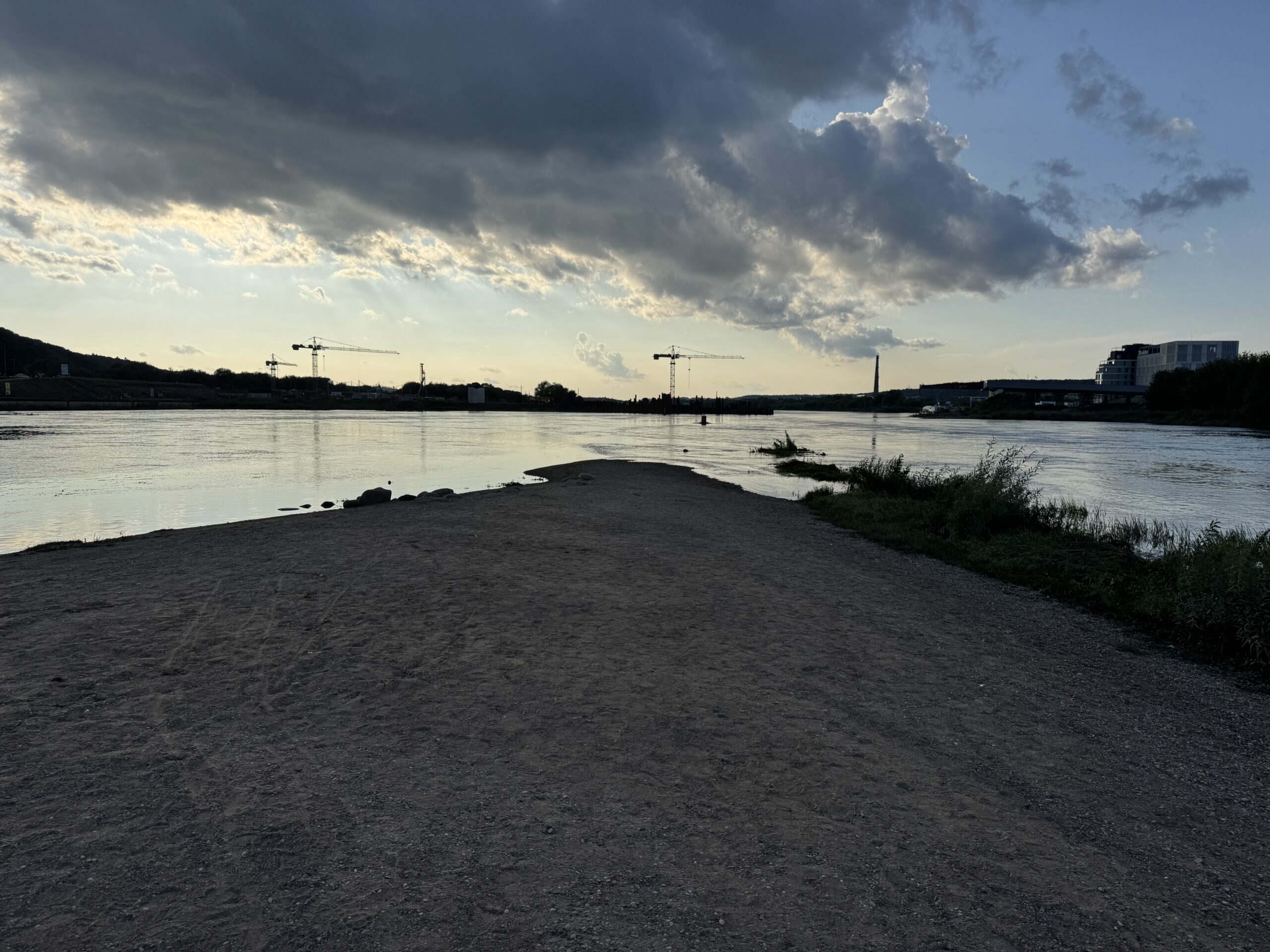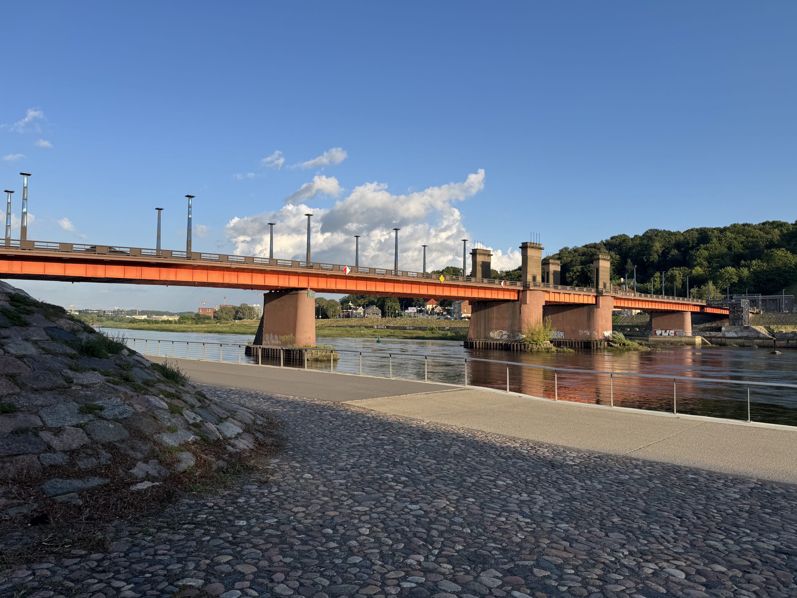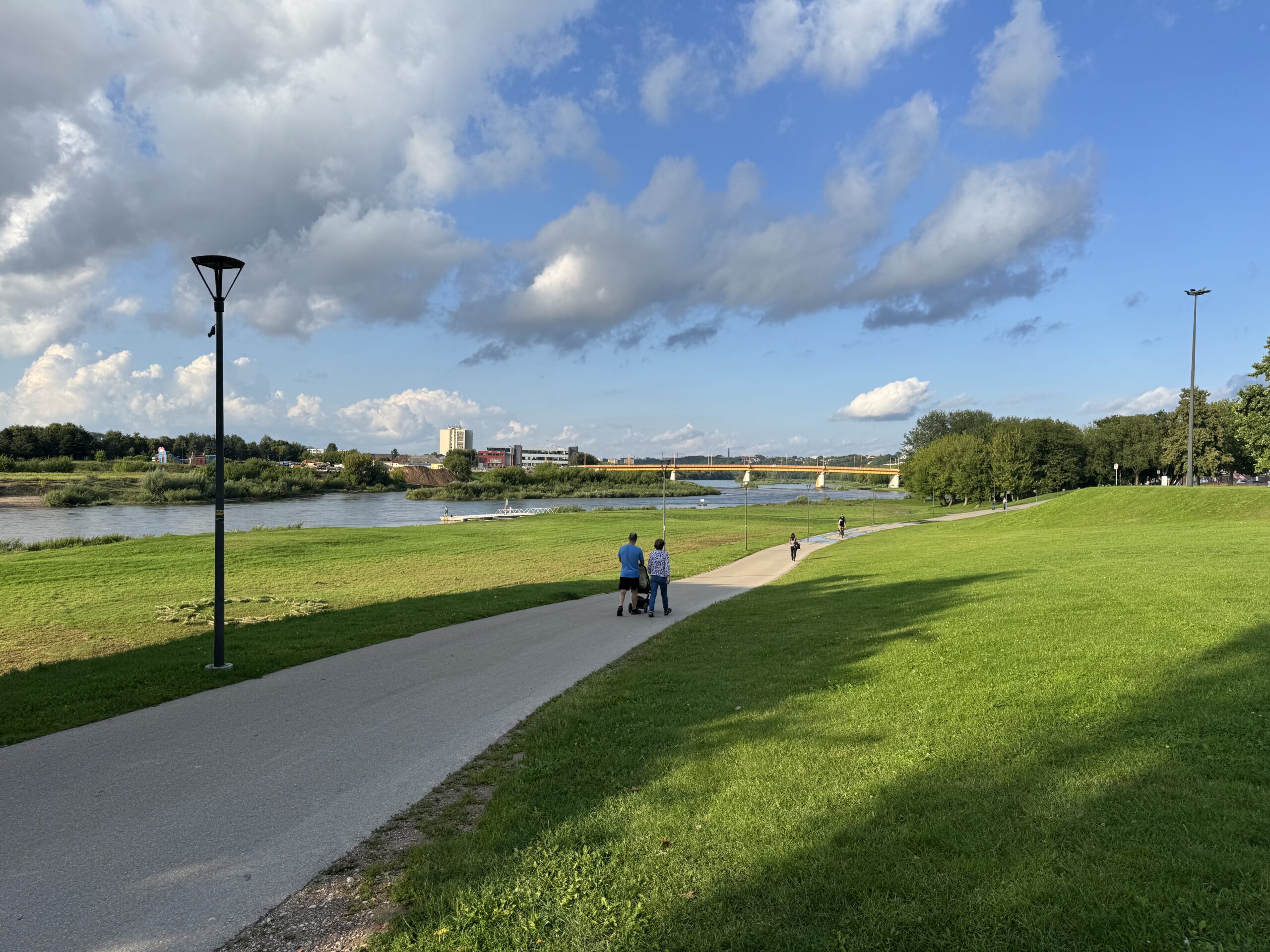 Ani zde jsme ale nevydrželi moc dlouho. Původně jsem počítal s tím, že se zajdeme podívat jen k řece, ale příjemný, čistý a velmi lehce dýchatelný vzduch lákal k většímu prozkoumání. Vydali jsme se tedy přes most do centra, kde jsme odstavili auto na příhodném (placeném) parkovišti a vydali se na pěší procházku.
