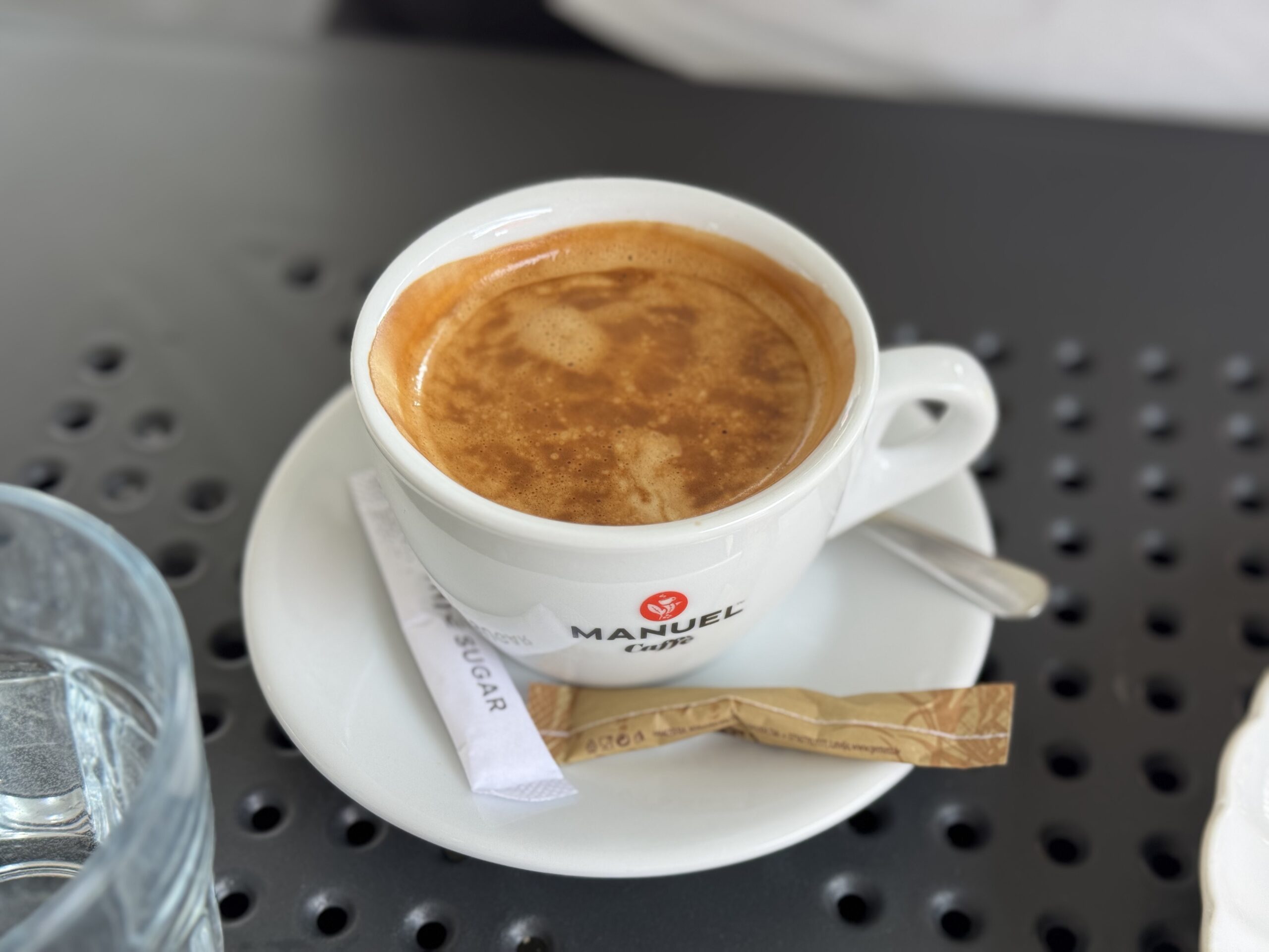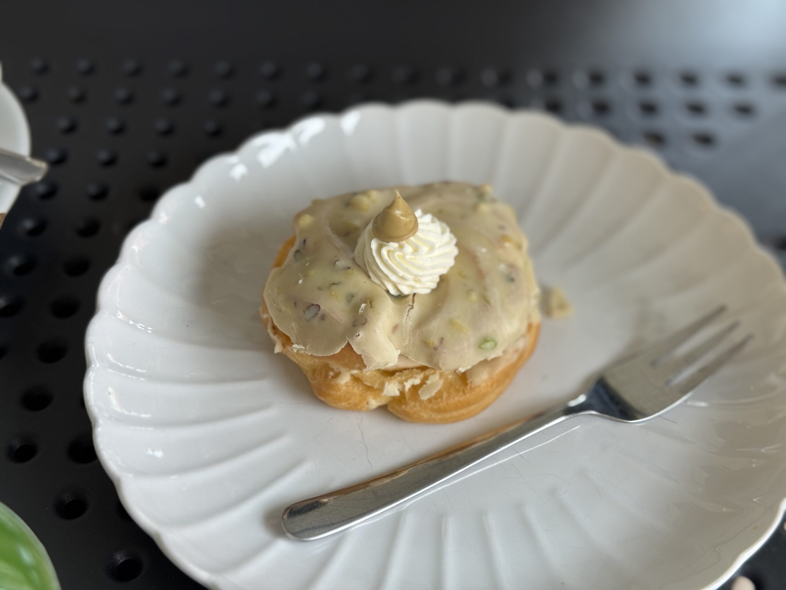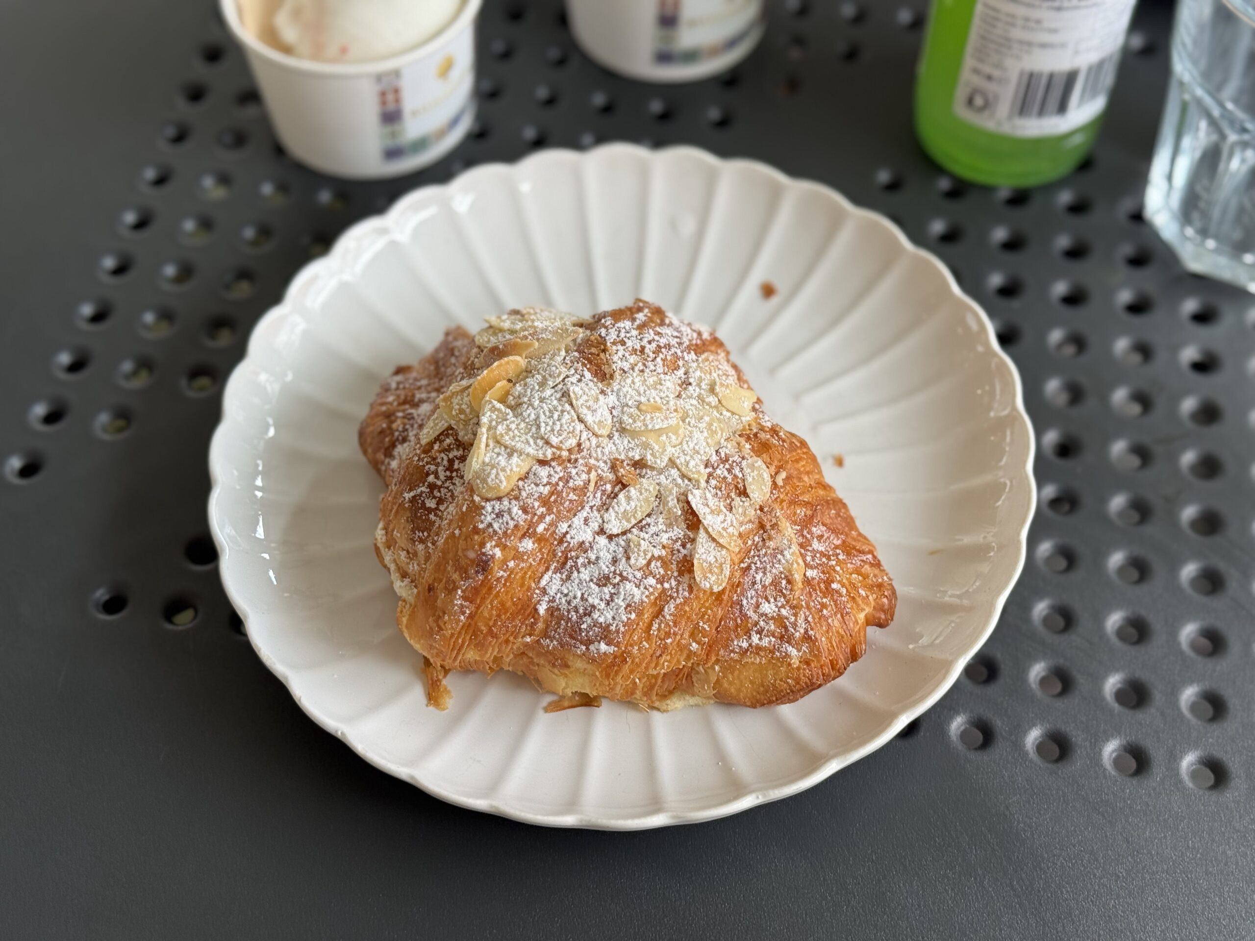 Zvolil jsem si croissant sypaný mandlemi a musím přiznat, že laťka byla nastavena proklatě vysoko. Byl naprosto lahodný, vláčný, voňavý po másle a jednoduše dokonalý. Troufám si tvrdit, že takto chutný kousek jsem dosud nikdy nejedl. Manželčin zákusek, který vzdáleně připomínal větrník, byl podle jejích slov neméně fantastický a chuťově naprosto delikátní.