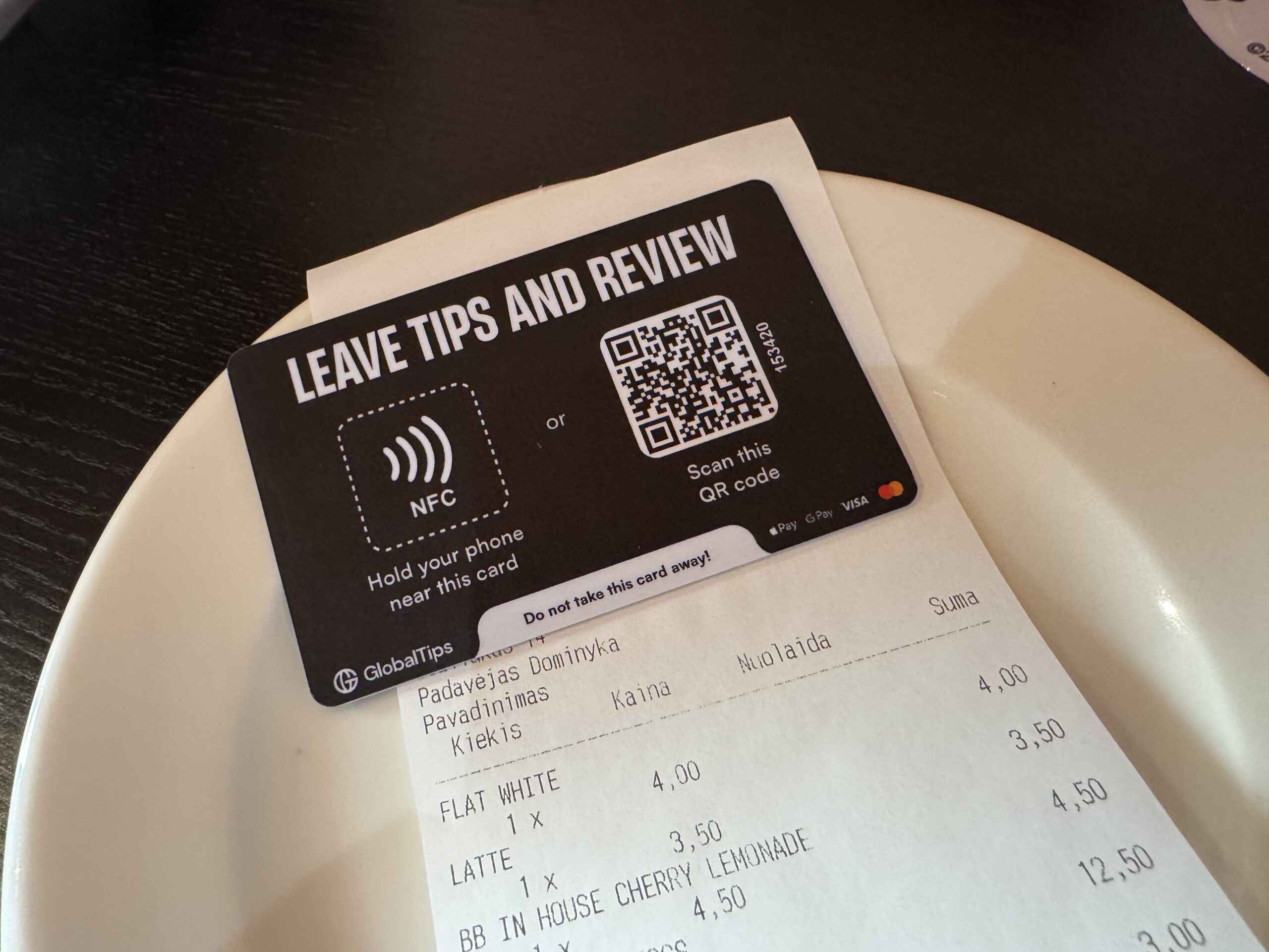 Velmi nás zaujal a potěšil inovativní způsob, jakým se zde nechává spropitné. Po zaplacení účtu kartou nám servírka na stole nechala kartičku s QR kódem a NFC čipem. Pomocí telefonu jsme si pak mohli jednoduše zvolit a odeslat částku přímo obsluze. Z mého pohledu technického redaktora jde o geniálně elegantní řešení pro bezhotovostní dobu.