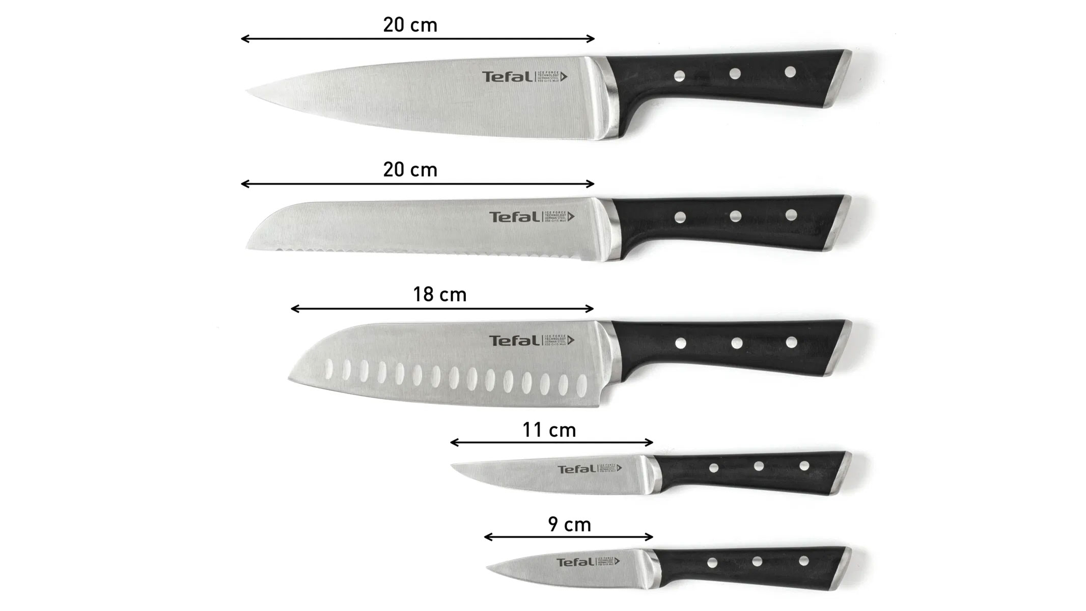 Základ sady tvoří pětice nožů s čepelemi z německé nerezové oceli, která vyniká vysokou odolností proti korozi. Součástí je robustní kuchařský nůž (20 cm), nůž na pečivo (20 cm), japonský santoku (18 cm), univerzální  (11 cm) a malý okrajovací nůž (9 cm).